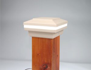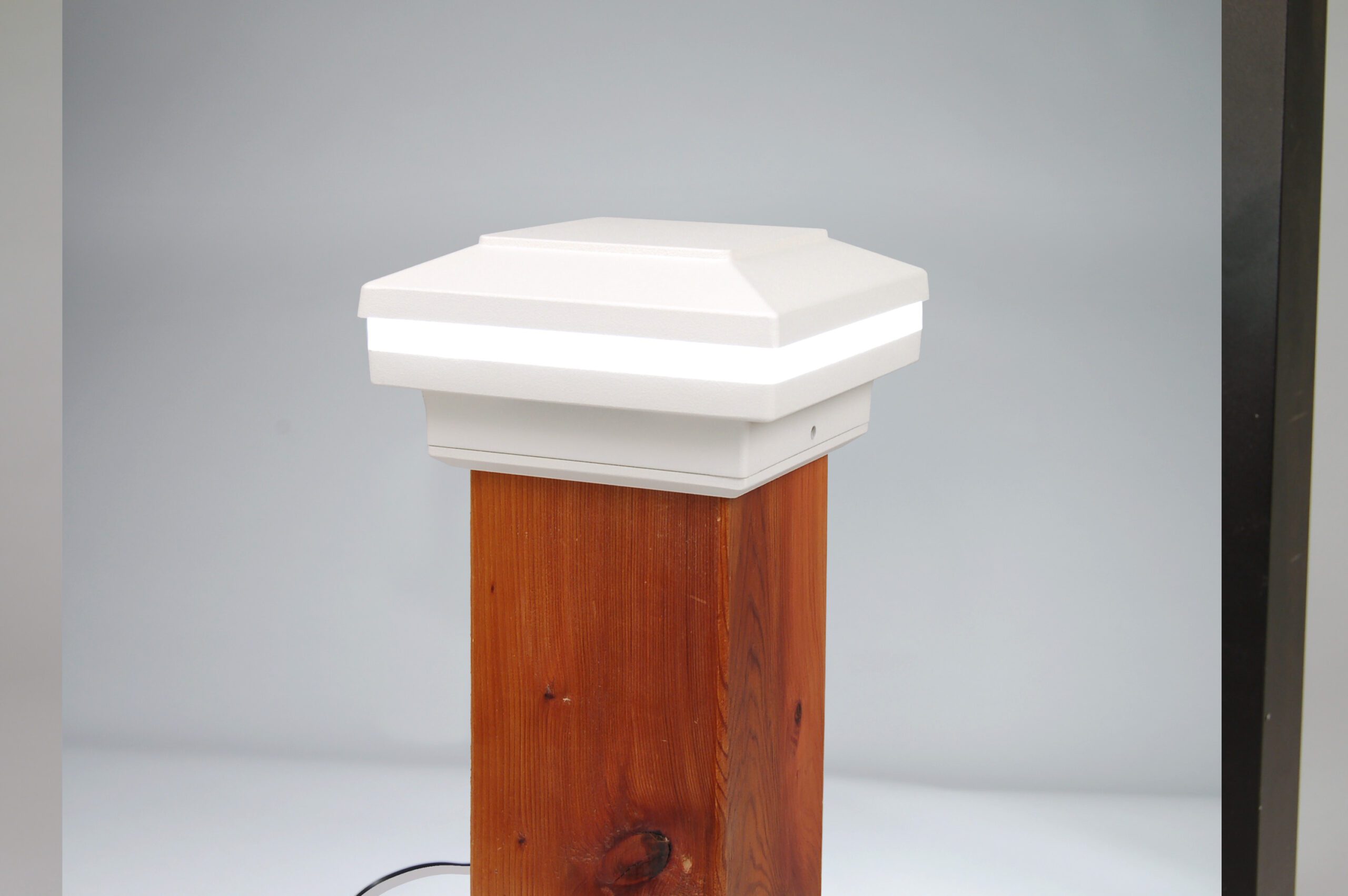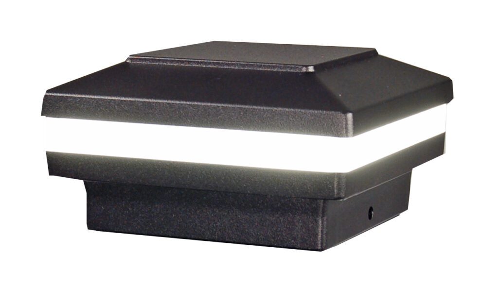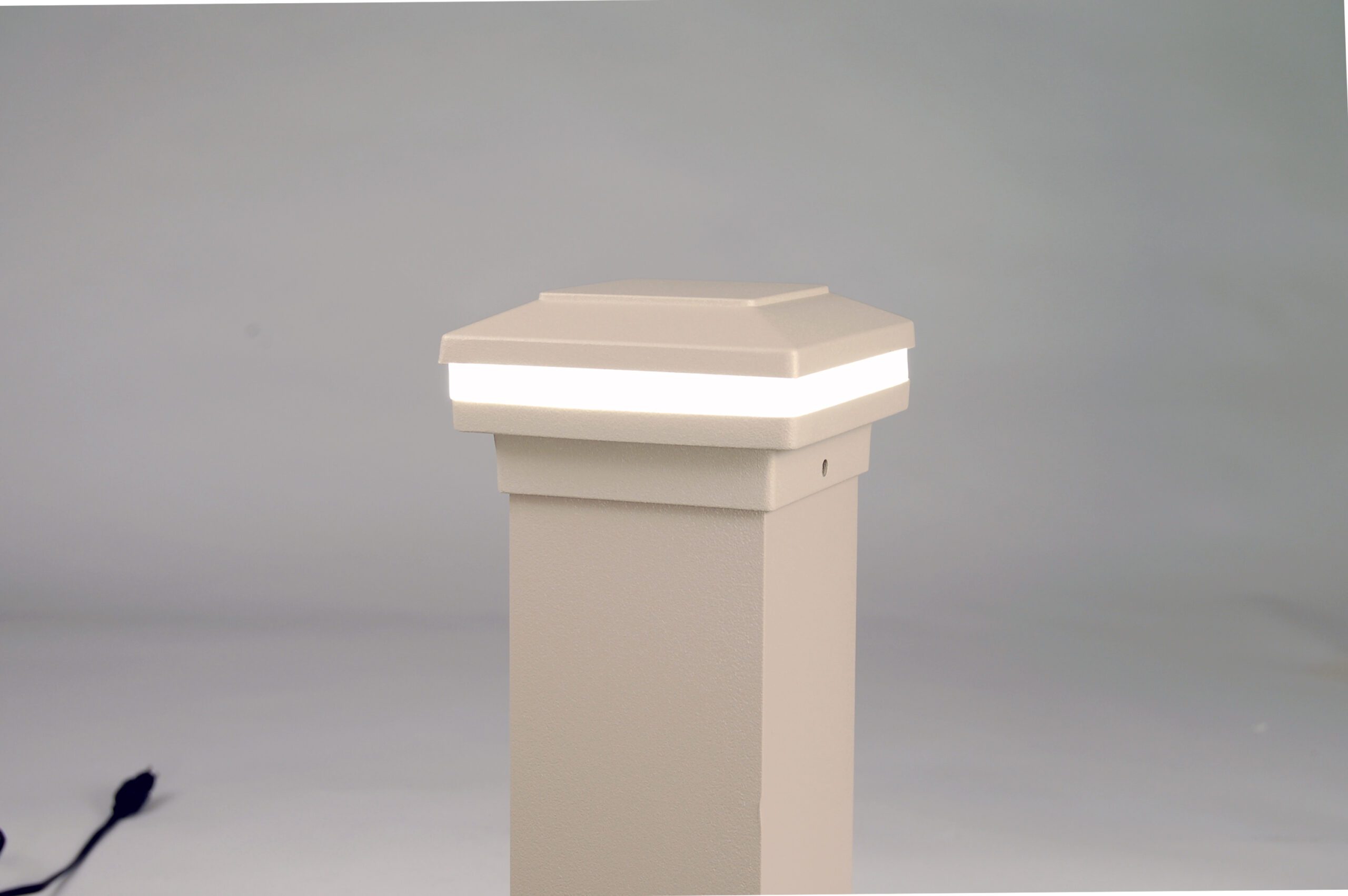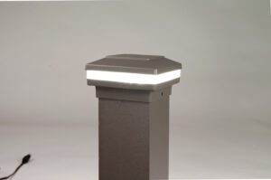 Aluminum flat top post cap with LED glow ring light. Features 2 quick connect leads for easy wiring. Draws 2.2 watts total per cap. Light color – 3000 – 3500K.