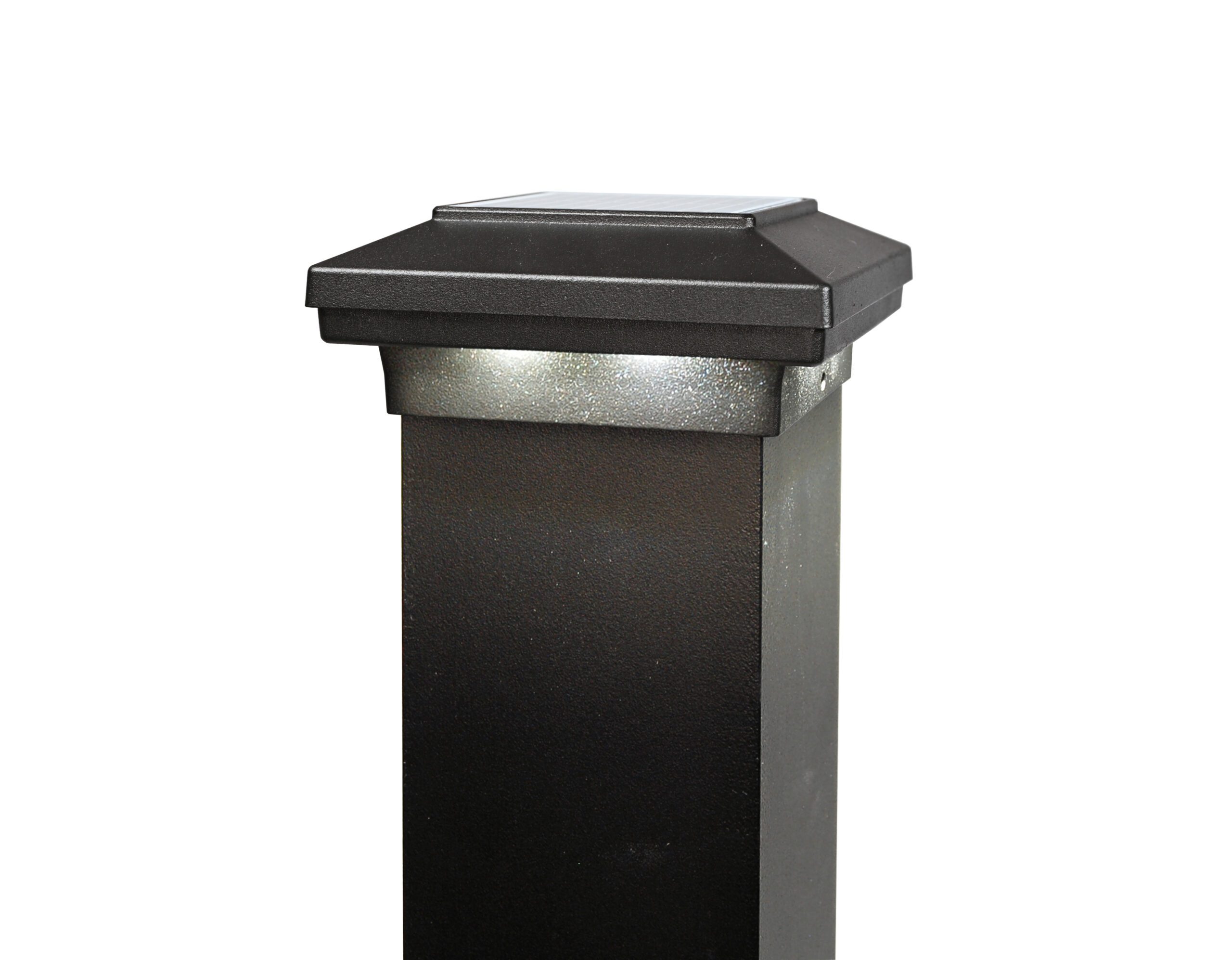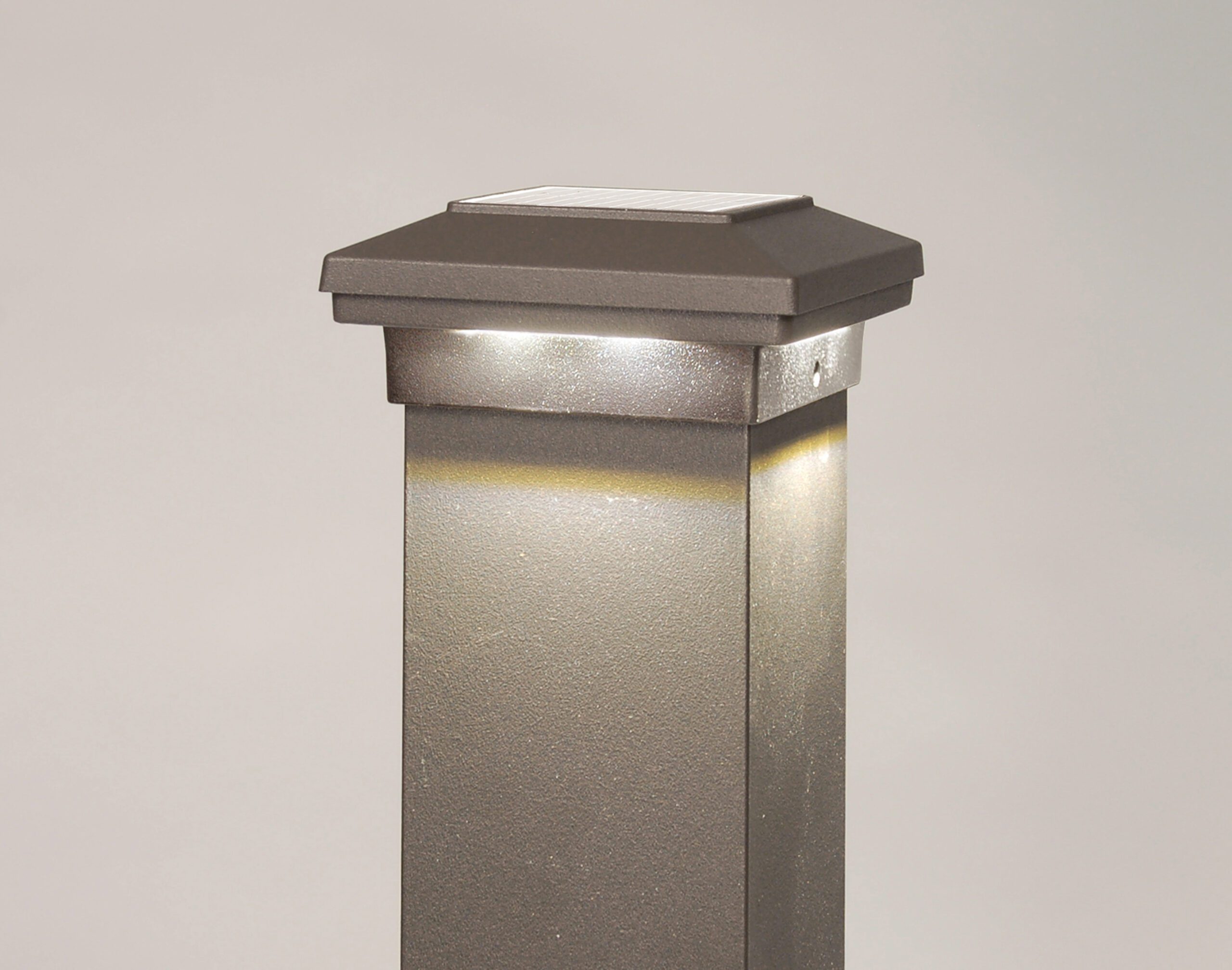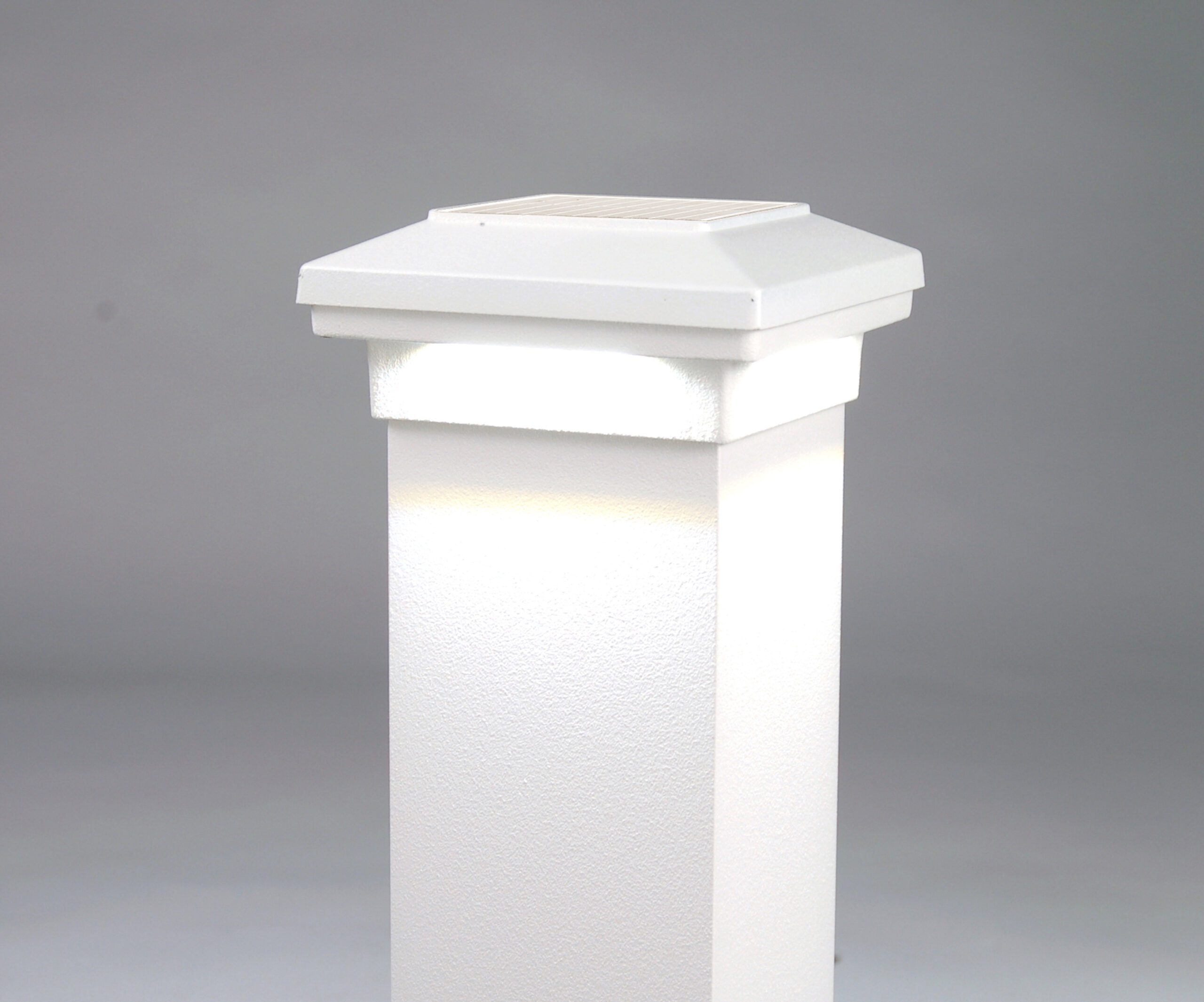 These solar aluminum flat top post caps by DekPro Effex features warm white LED down lights on all 4 sides to cast light in all directions around the post. Features state of the art solar collector and long lasting lithium ion rechargeable battery pack. Light color – 3000 – 3500K.